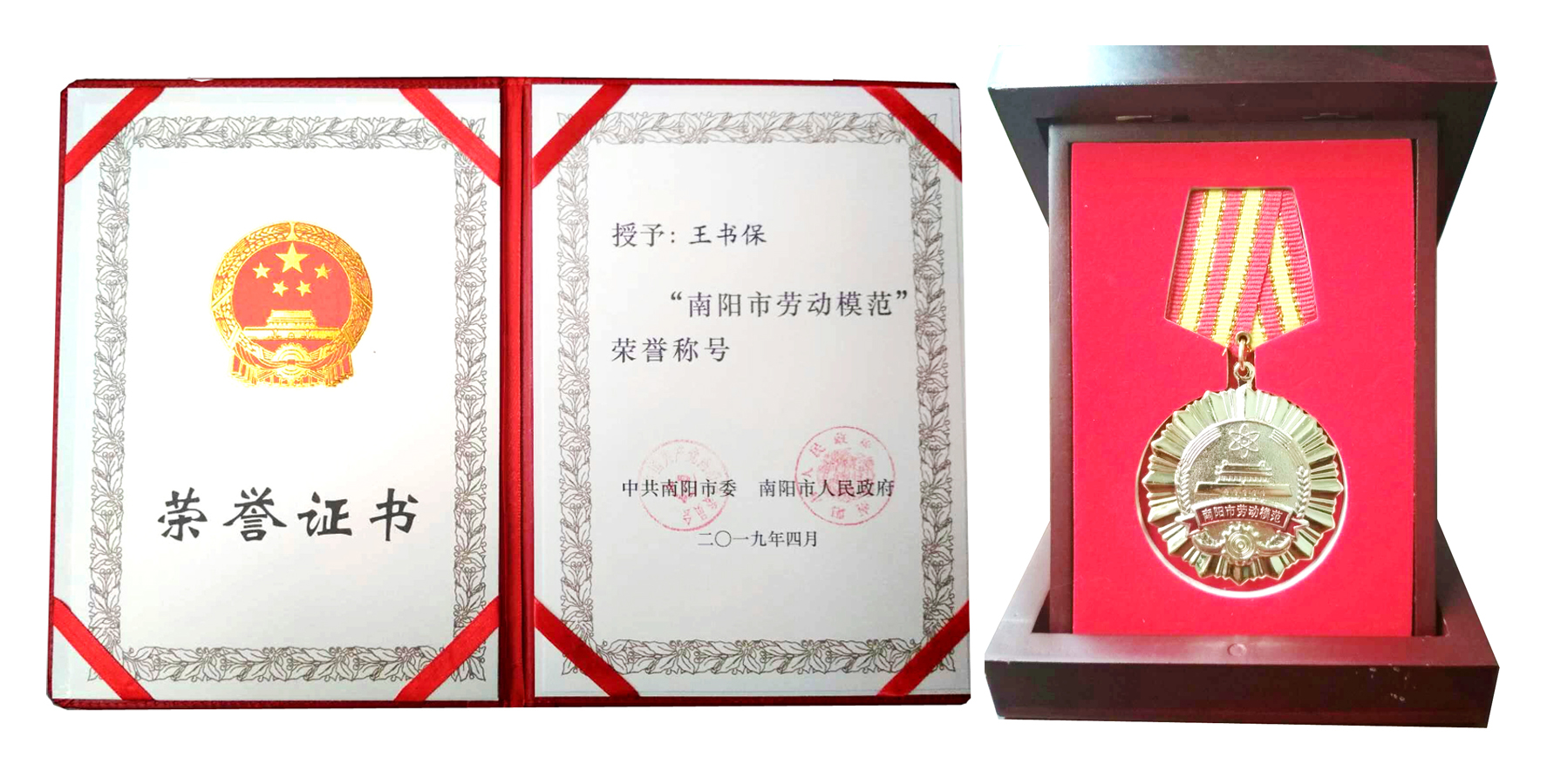 南陽市委、市政府授予王書保“南陽市勞動模范”榮譽證書